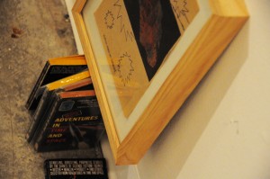 Trash bags filled with discarded images, paintings piled in a corner, Doctor Who references throughout the small space and a small scrolling marquee left its mark on the viewer expecting something a little more typical.