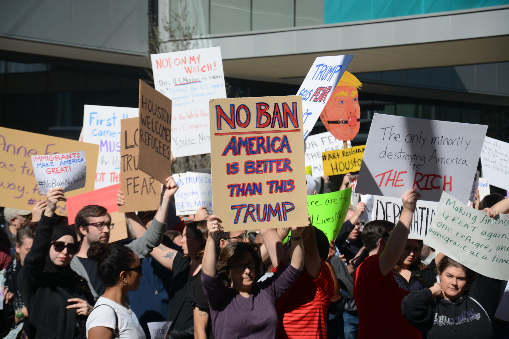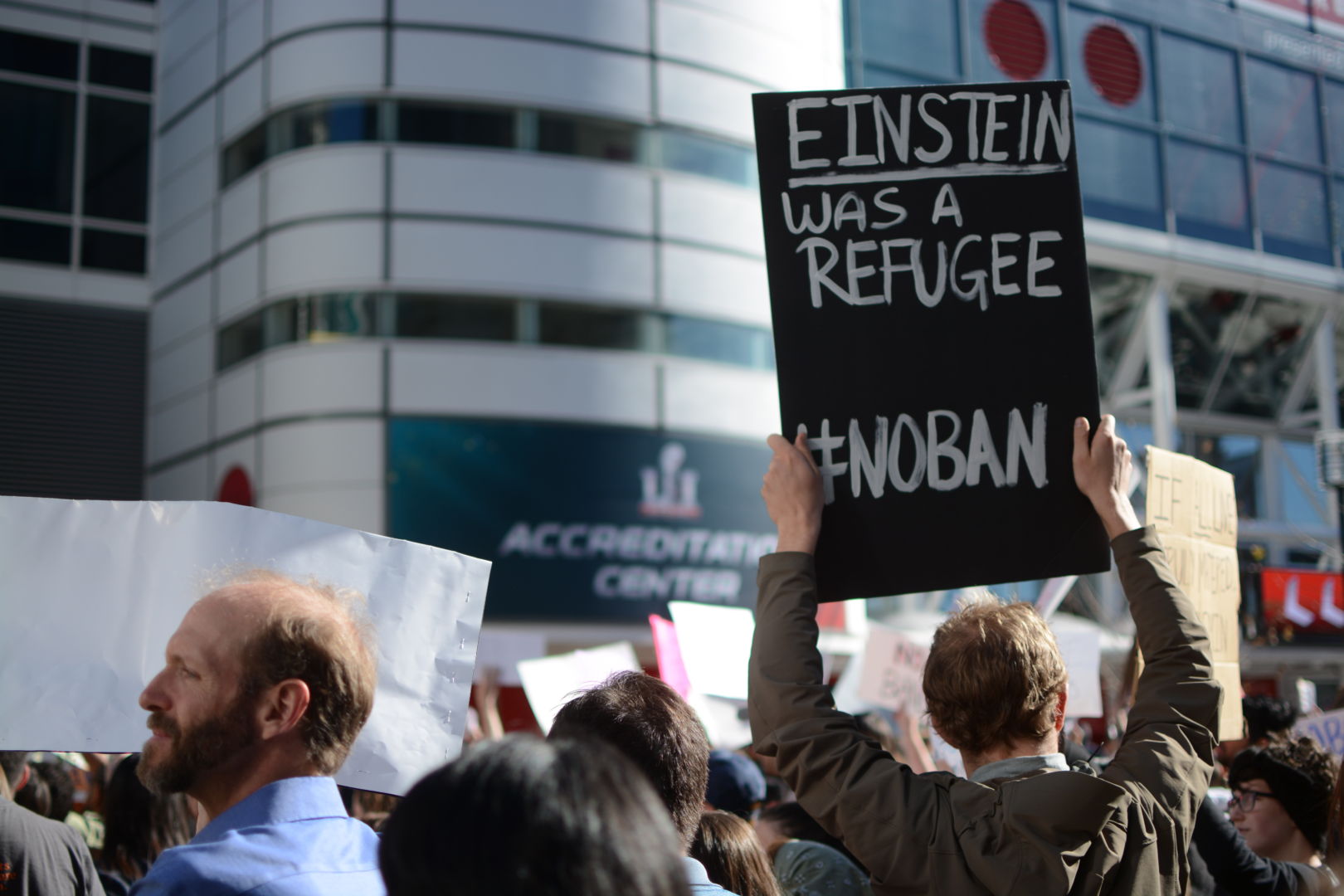 While many took to Discovery Green in celebration of the upcoming Super Bowl LI, more than 1,000 protesters gathered in front of the game’s headquarters to protest President Donald Trump’s travel ban.