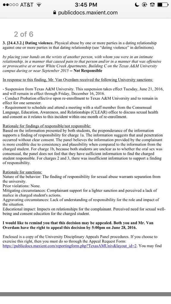 The sanctions for Van Overdam included suspension for one semester, conduct probation effective once he re-enrolled, and a mandatory meeting to discuss consent and sexual health with a member of the Consensual Language, Education, Awareness, and Relationships office, according to a letter sent to Shaw by A&M.