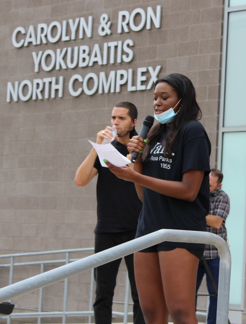 Junior outside hitter Alexis Cheatum speaking to the crowd of fellow student-athletes, coaches and family. “If anything, I think we are using our platform to make positive momentum,” she told reporters before the march officially began. | Donna Keeya/The Cougar