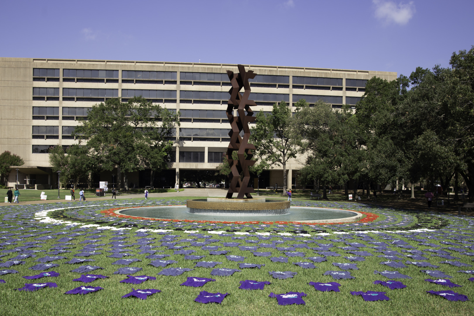 The demonstration involves laying out t-shirts around the fountain in front of the library.