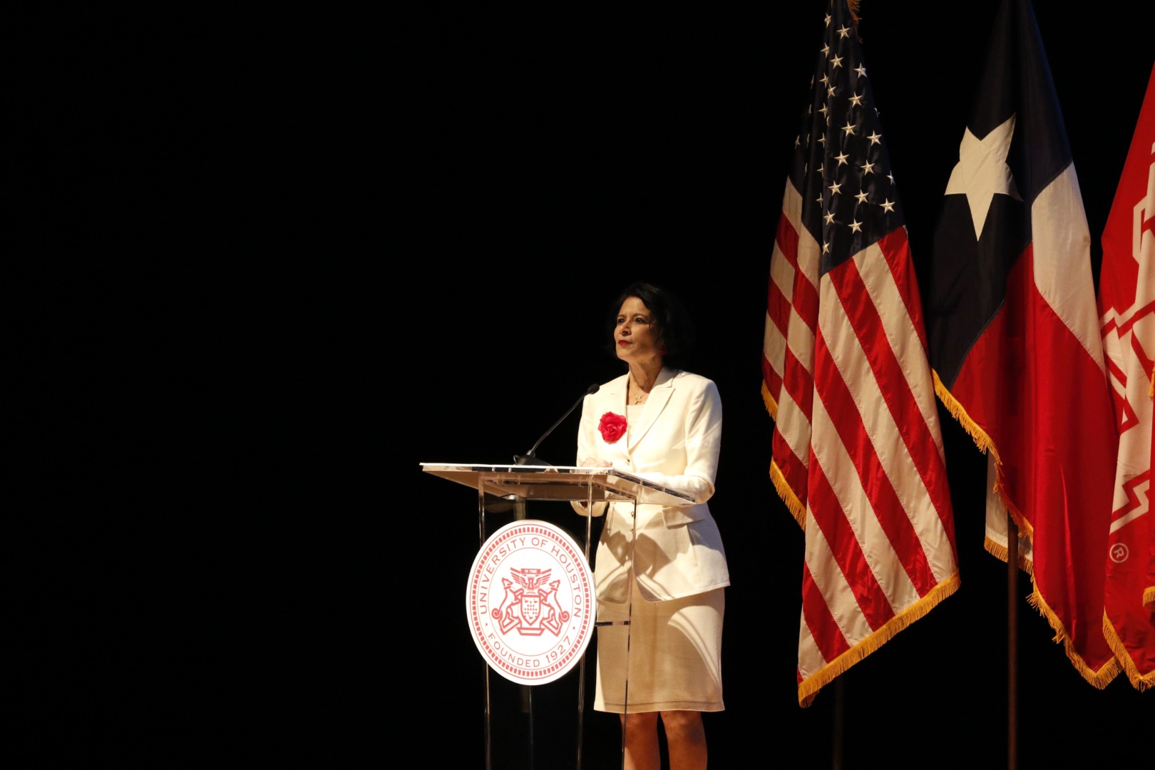 President Khator delivering her State of the University Address at the Moores School of Music auditorium on Wednesday Oct. 9, 2024. | Emma Christensen/The Cougar