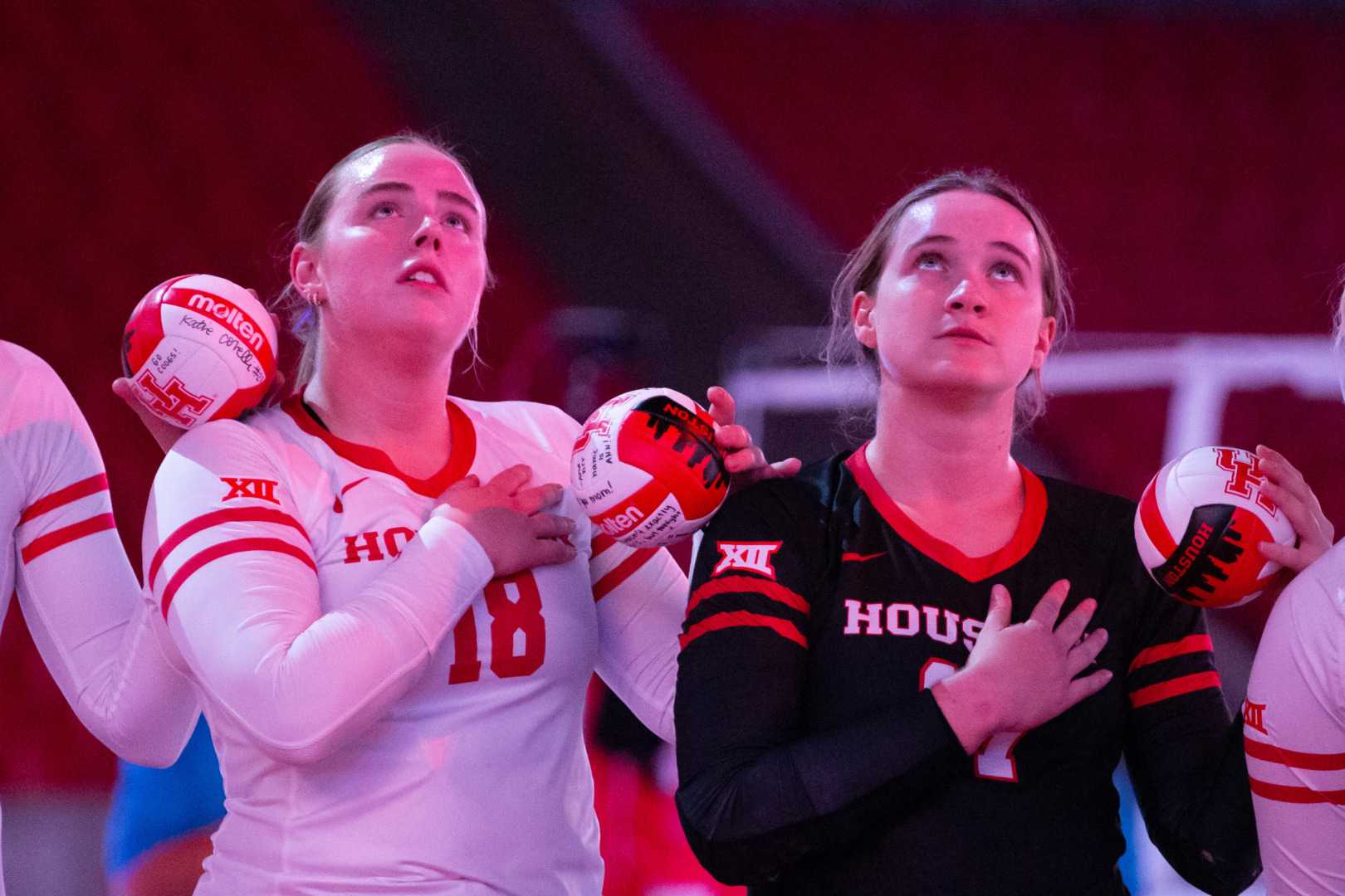 Houston setter Annie Cooke (18) and libero Kate Georgiades (17) participate in the pledge of allegiance before an NCAA college volleyball match, on Thursday, Nov. 14, 2024, in Houston, Texas. | Raphael Fernandez/The Cougar