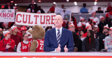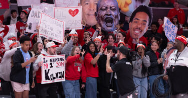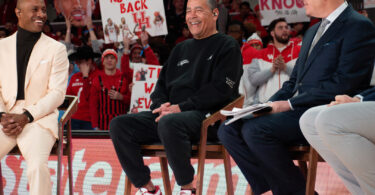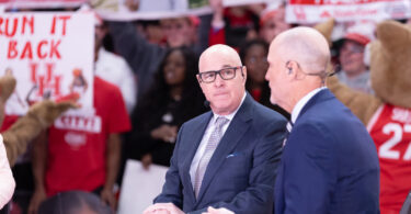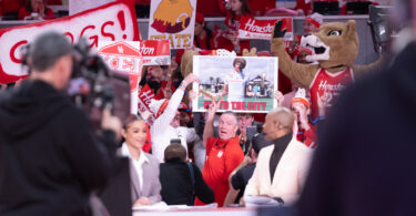 Inside, audience members, painted in red and white, held creative signs, providing a vibrant backdrop for the GameDay desk, where analysts Jay Bilas, Andraya Carter, Seth Greenberg, Jay Williams and host Rece Davis set the stage for Houston’s matchup against Iowa State.