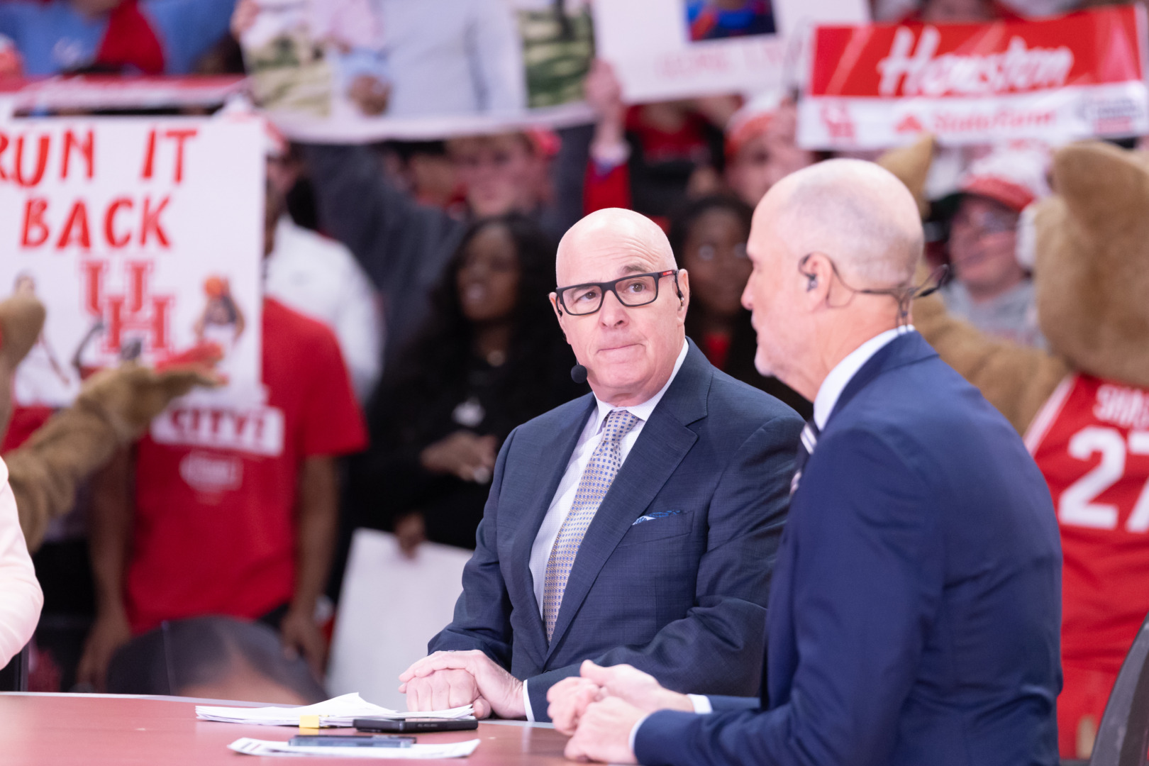 Analyst Seth Greenberg raises an eyebrow towards analyst Jay Bilas during ESPN College GameDay at the Fertitta Center, Saturday, Feb. 22, 2025 in Houston, Texas. | Raphael Fernandez/The Cougar