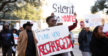 The protest drew approximately 40 attendees, many carrying signs that read “No Moore Silence” and “Where is Moore.”
