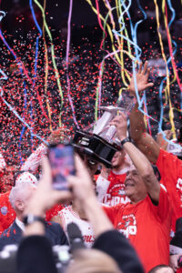Houston celebrates winning the Big 12 Championship as streamers and confetti rain down, Saturday, March 15, 2025, in Kansas City, Missouri. | Raphael Fernandez/The Cougar