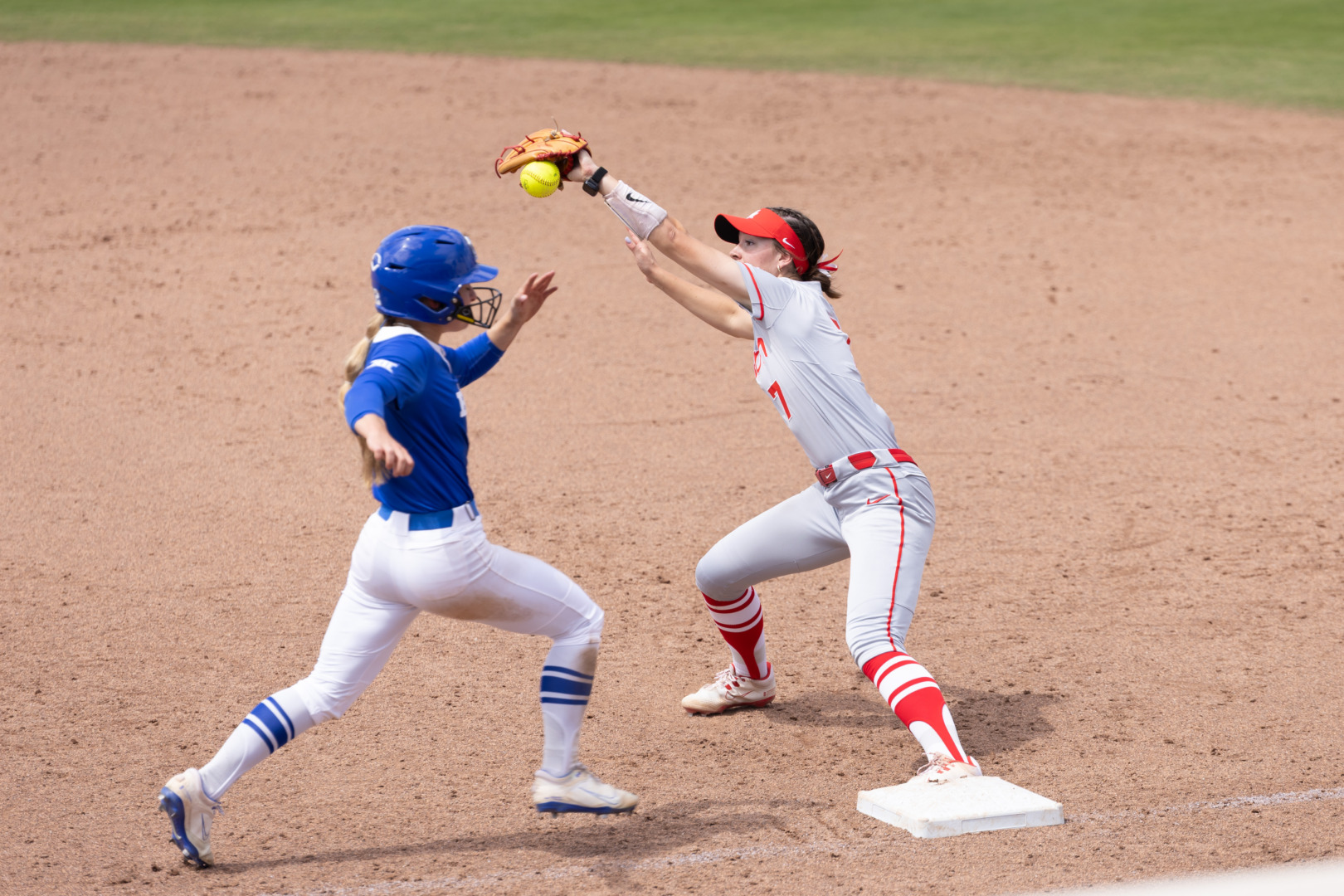 Houston infielder Mandy Esman (7) attempts to tag out BYU outfielder Lauren Flanders (12) during an NCAA softball game, Saturday, March 22, 2025, in Houston, Texas. | Raphael Fernandez/The Cougar