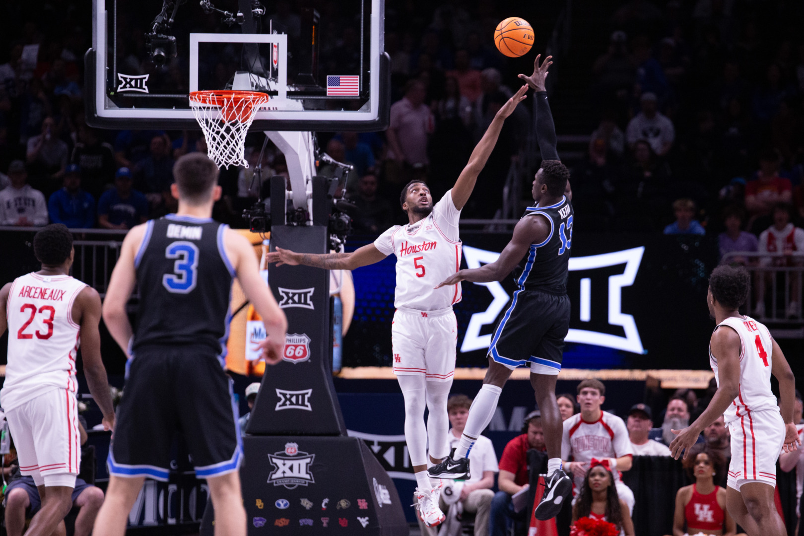 Houston forward Ja’Vier Francis (5) leaps to block BYU center Keba Keita (13) during the first half of the Big 12 Semifinals, Friday, March 14, 2025, in Kansas City, Missouri. | Raphael Fernandez/The Cougar