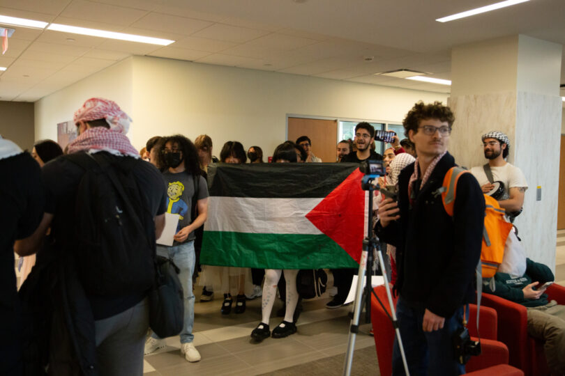 The protesters moved to the flag poles outside SC North, where they stood with Palestinian flags. They restated their demands and asked students to not be afraid to speak out against genocide.