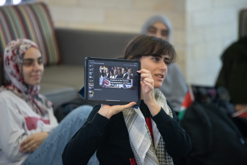 The SJP wanted to focus on the educational aspects for their cause. This included topics like the use of AI face detection during protests, the Palestinian experience and reading from the book, Salt Houses.