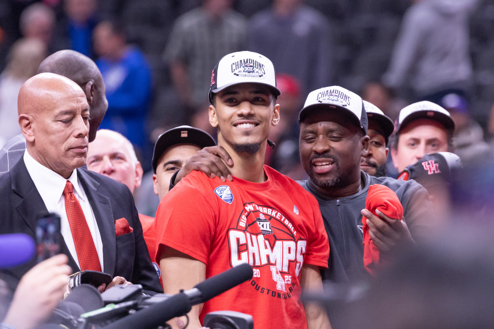 Houston guard Milos Uzan smiles on stage after winning the Big 12 Championship, Saturday, March 15, 2025, in Houston, Texas. | Raphael Fernandez/The Cougar