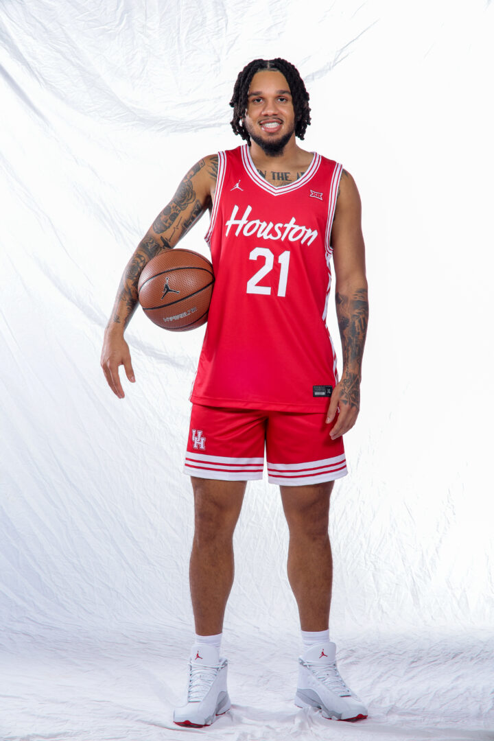 Emmanuel Sharp (21) wears a red Houston jersey at the 2024-25 media day. | Courtesy of UH Athletics