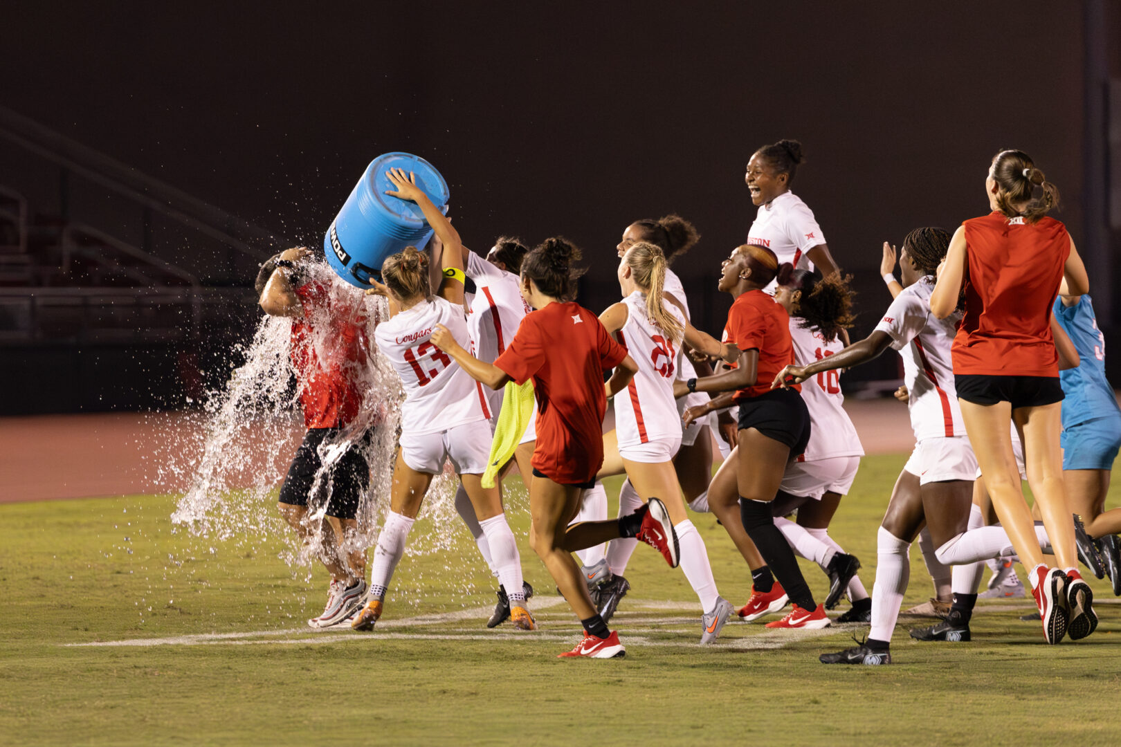 Houston coach Ben Williams receives a celebratory ice bucket shower from the soccer team after beating Texas, Sunday, Aug. 24, 2025, in Houston, Texas. | Raphael Fernandez/ The Cougar.