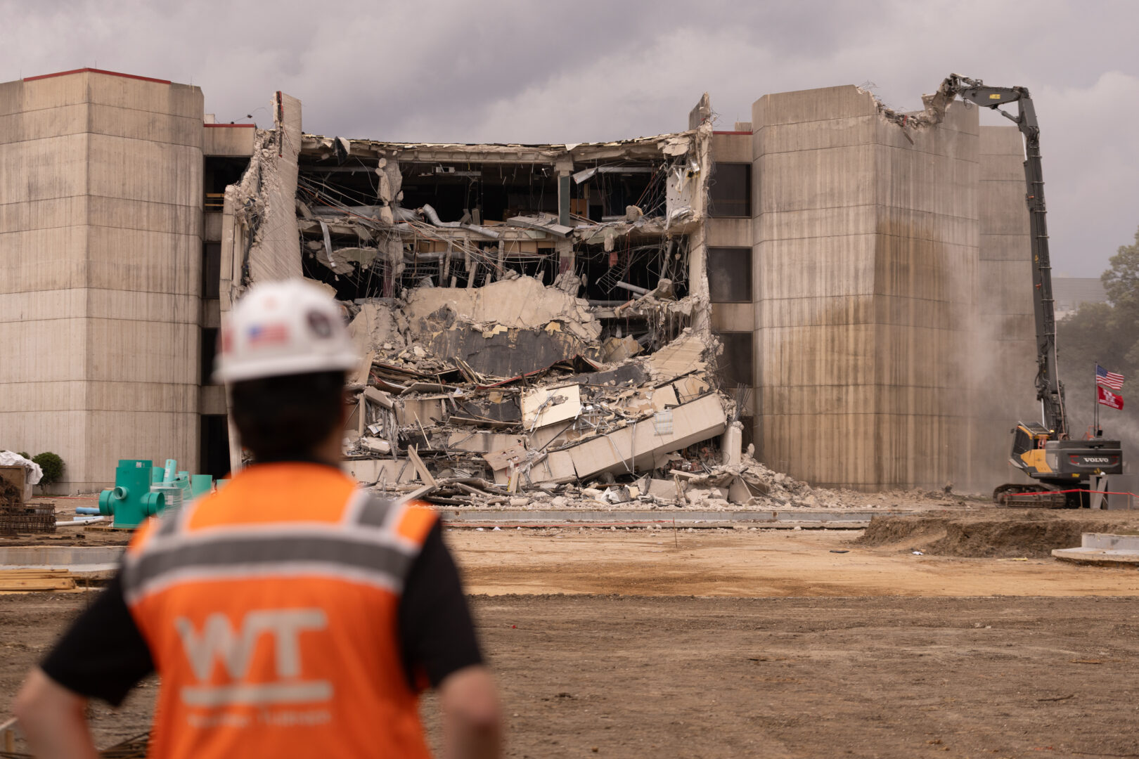 A worker looks ahead at Farish Hall’s demolition on Monday, Nov. 24, 2025 in Houston, Texas. | Raphael Fernandez/The Cougar