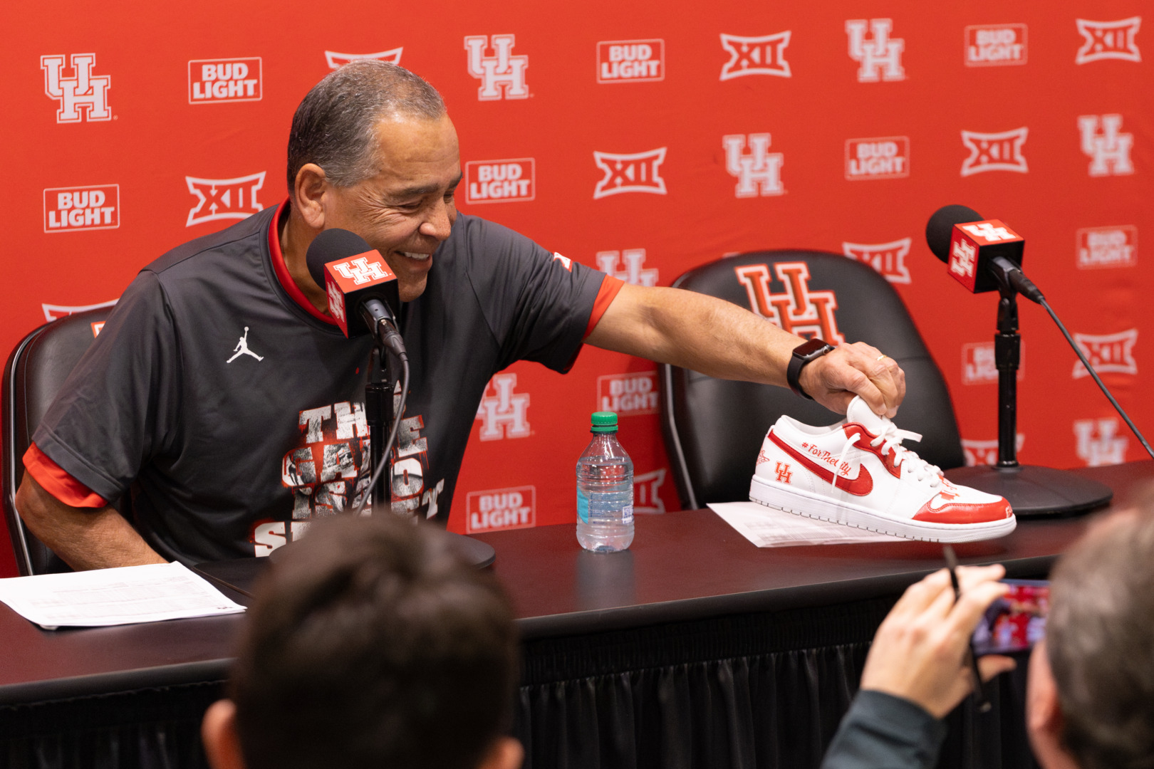 Houston Cougars coach Kelvin Sampson shows off his custom Eracism Jordans after an NCAA college men’s basketball game on Wednesday, Jan. 4, in Houston, Texas. | Raphael Fernandez/The Cougar