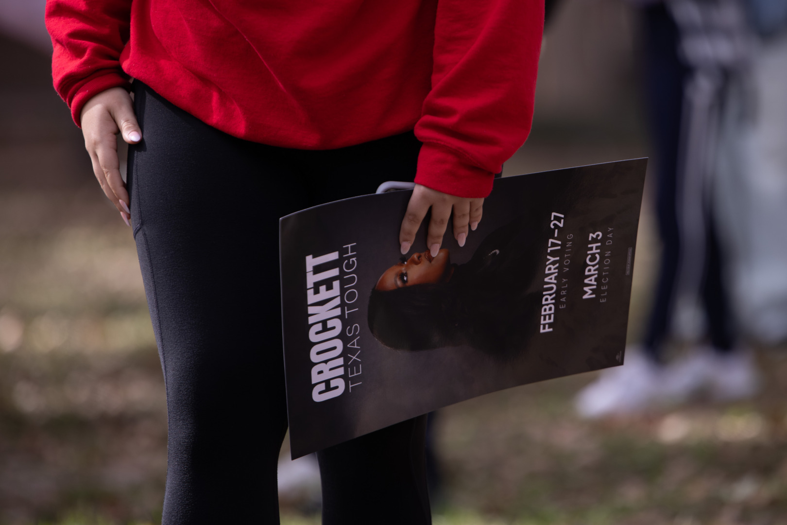 Student holds a campaign sign for U.S. Rep. and Senate candidate Jasmine Crockett on Wednesday, Feb. 25, 2026, in Houston, Texas. | Raphael Fernandez/The Cougar