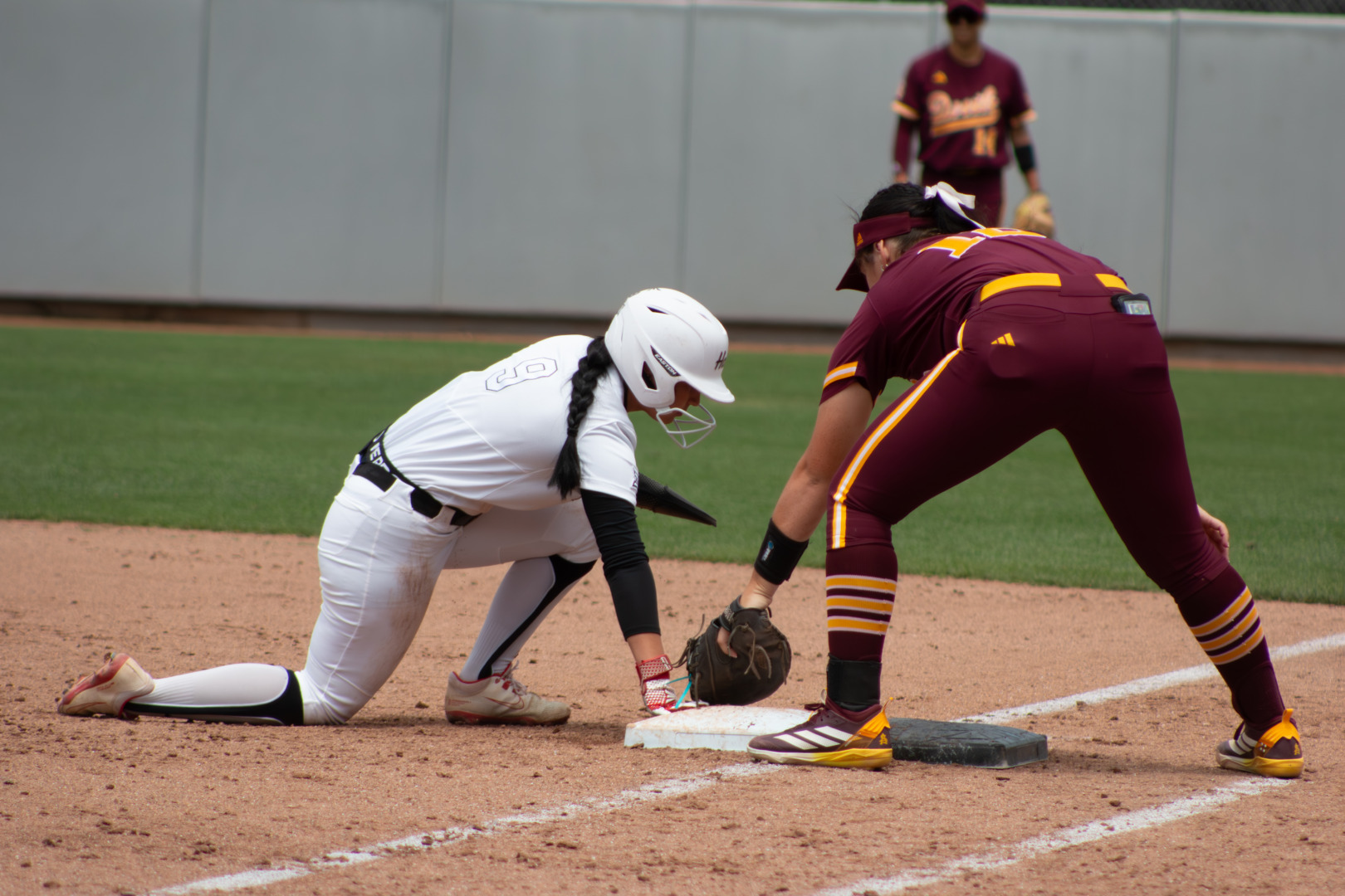 Houston infielder Leilani Garcia reaching back to first base, avoiding elimination during the top of the fourth inning of an NCAA softball game against Arizona State, on Sunday, April 19, 2026, in Houston, Texas. | Luis Diego Gonzalez/The Cougar